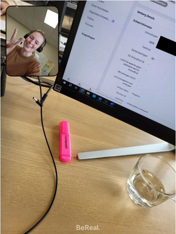 Ik kan niet teveel vertellen over de werkzaamheden die ik doe, in verband met een geheimhoudingsplicht. Ik krijg echt flink op m'n donder als ik dat online gooi, dus dat doe ik niet. Ik kan je wel vertellen dat ik veel klantcontact heb met scholen en dat ik heel veel moet bellen met scholen. Het voordeel is dat de tijd snel gaat, want de dag is zo om.