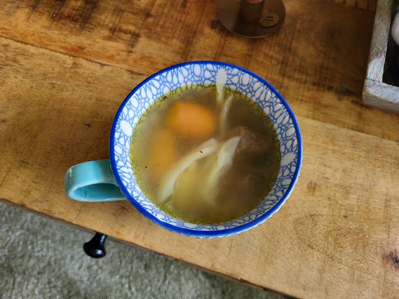 3. Voeg na 45 minuten de wortels, aardappels en ui toe aan de pan. Voeg vervolgens ook de bouillon toe. Roer vervolgens het geheel goed door elkaar en laat 15 minuten sudderen.