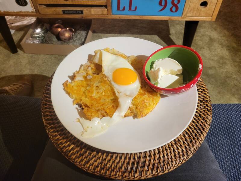 6. Flip de rösti's en bak weer 5 minuten. Bak intussen ook 3 eieren.