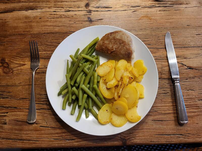 5. Giet de sperziebonen af en serveer met de aardappelschijfjes en de cordon bleu.